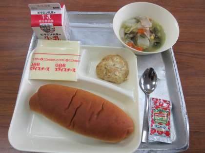 献立:とうふハンバーグ、スープ煮、スライスチーズ、パン・牛乳