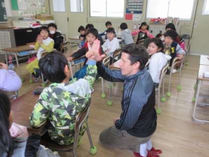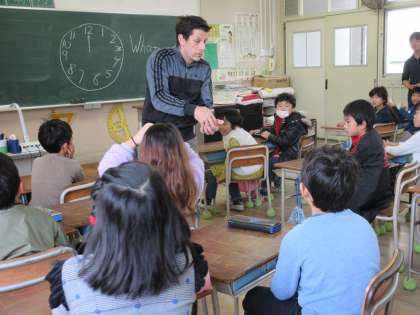 本校では、1年から英語に親しむ活動をおこなっています。毎月、外国人講師による英語の授業を各学級ごとに行っております。「英語は耳から」ネイティブスピーカーによる本物の英語に慣れ親しみましょう!今日はMat先生です。