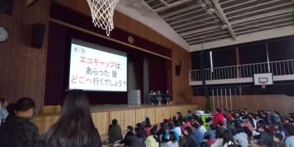 今日のふれあい集会は、環境委員会の発表でした。委員会の活動を、クイズで発表していました。