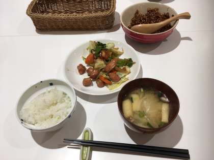 (ご飯、みそ汁、野菜炒め、ふりかけ)