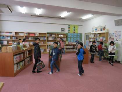 3年生が図書館にやってきました。めいめい思い思いのところで読みたい本を探し始めました。ジャンルごとに整理された図書館で、新たな出会いと発見があるようです。本はお友達です。
