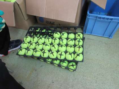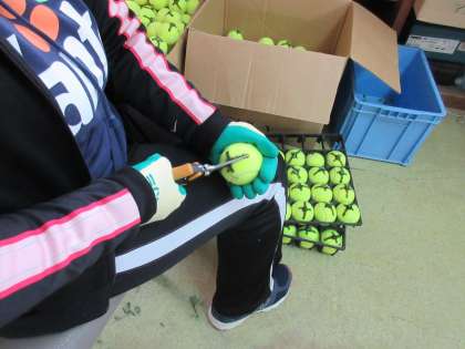 本校では、教室の机椅子の脚にテニスボールを取り付けて、聴覚支援を必要とする児童の騒音による負担軽減や、静寂な学習環境の確保に取り組んでいます。先日、ノアテニスステージ様にいただいたテニスボールを教習用机椅子に取り付けられるように切り込みを入れる作業を教職員が行っています。