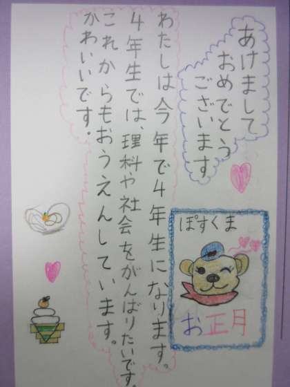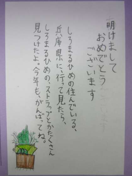 夏に頂いた暑中見舞いでは思いのほかたくさんのお返事があったので、子どもたちも期待に胸を膨らませて年賀状を書いていました。どうでしょうか?たくさんのお返事が返ってくるのでしょうか?また、お返事がありましたらご紹介します。