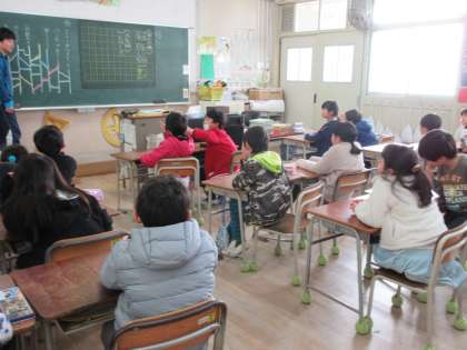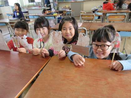 2組はお楽しみ会のペープサートづくりをおこなっています。出来上がったものを見せてくれました。1組はお楽しみ会のテーマをみんなで選んでいます。