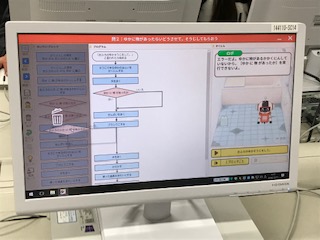 6年生は、すでにフローチャートを学習して、ロボットにお風呂掃除をさせるプログラミングに挑戦しました。作業の流れを考えてプログラムしていきます。