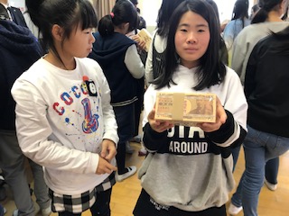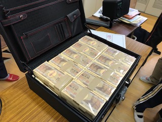 税金の仕組みや使われ方など、わかりやすくお話していただきました。1億円(レプリカ)の入ったケースをもってきていただきました。それぞれ1千万の束を手に取って見せていただきました。