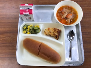 献立:豚肉と野菜のケチャップ煮、きゅうりとコーンのサラダ、桃のクラフティ、パン、牛乳