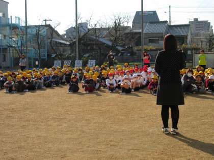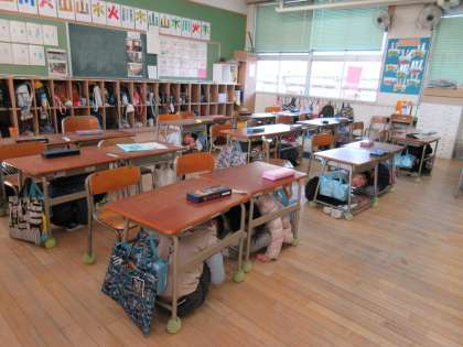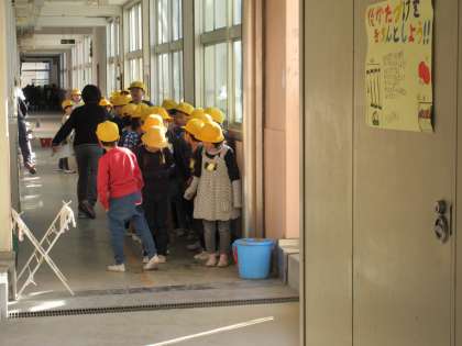 揺れが収まるまで、机の下に身を隠くす。安全を確認して担任の誘導に従ってグラウンドの安全な場所に集合する。何度も行っていますので、スムーズに行えることができました。合言葉は「お・は・し・も」です。押さない、走らない、しゃべらない、戻らないです。