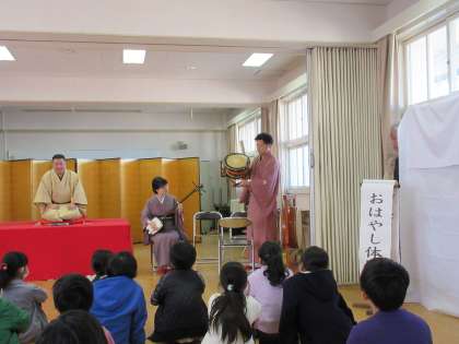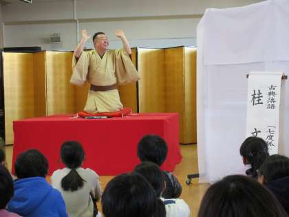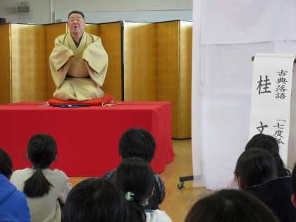 落語体験授業の2回目がありました。前回に引き続き桂文三師匠に教えていただきました。今日の落語は「七度狐」です。二人連れが、深江で笠を買ってお伊勢参りに行くお話ですが、すっかり狐に騙されてしまいました。