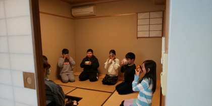 ケアハウスレインボーのお茶室で、茶道体験をさせていただきました。お茶のいただき方を教えていただいてから、グループで体験をさせていただきました。