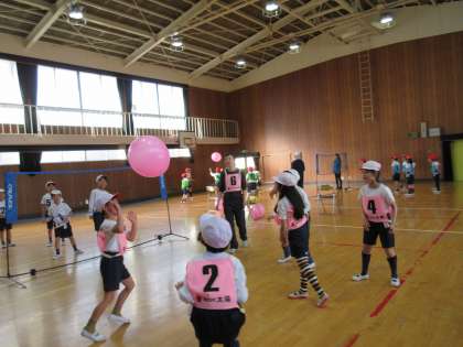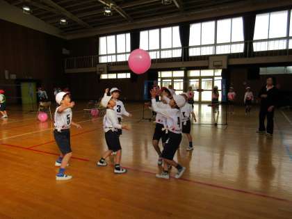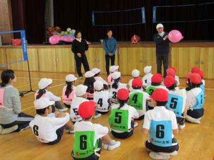 大阪ふうせんバレーボール普及会から、ふうせんバレーボールの指導に来ていただきました。ふうせんバレーボールは老若男女、障がいがあっても誰でもができるように工夫されたバレーボールです。今日は簡単なゲームをおこないました。事前に少し練習をしていたので、3年生は呑み込みも早く、全員がゲームに参加することができました。