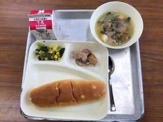 献立:鶏肉のオイスターソース焼き、糸寒天のスープ、チンゲンサイとコーンの中華あえ、パン、牛乳