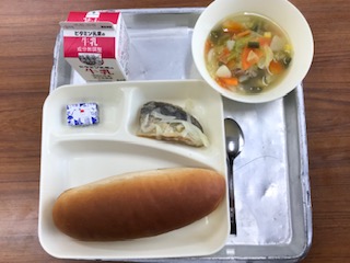 献立:あじのレモンマリネ、スープ煮、固形チーズ、パン、牛乳