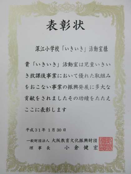 大阪市の放課後対策事業で実施している「いきいき活動室」ですが、昨日、本校のいきいき活動が大阪市文化振興財団理事長より表彰されました。おめでとうございます。