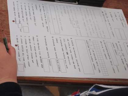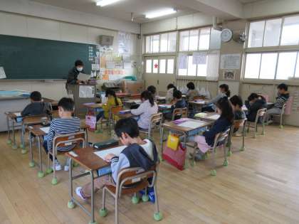 1年生のかきとりテストの様子です。先生のお話をよく聞いて答えを書きましょう。