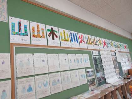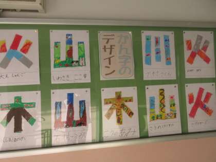 1階の掲示板に漢字のデザインがありました。1年生の教室には全児童の作品が掲示されていました。山は山らしく、川は川らしく描かれています。