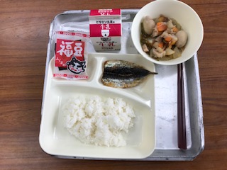 献立:いわしのしょうがじょうゆかけ、含め煮、いり大豆、ごはん、牛乳