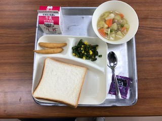 献立:わかさぎフライ、スープ煮、三度豆とコーンの甘酢あえ、パン、牛乳