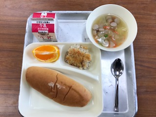 献立:押し麦のグラタン、スープ、デコポン、パン、牛乳