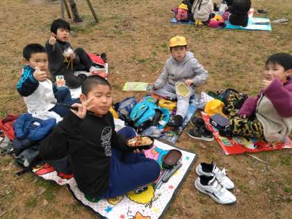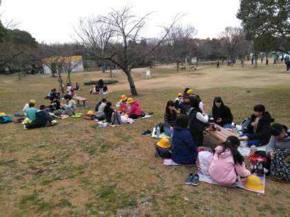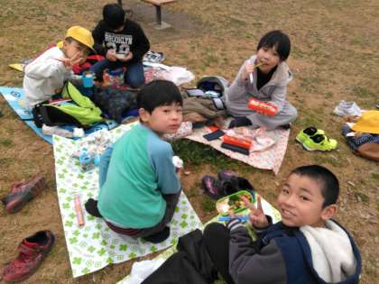 車いすバスケットボールの観戦の後、お弁当の時間です。お天気がよかったので八幡屋公園でお昼ご飯を食べました。少し風が冷たかったですが、お弁当の後、広い公園で鬼ごっこなどをして、みんなで遊ぶ時間もありました。