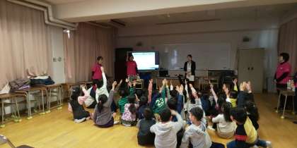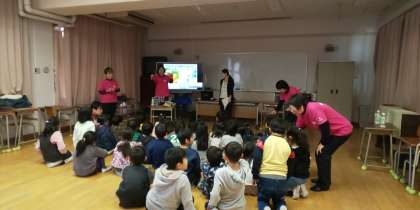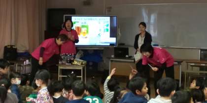 今日は1年生に、東成区の管理栄養士の方と食生活改善推進員の方々に来ていただき「おやつについて」の栄養教育をしていただきました。
