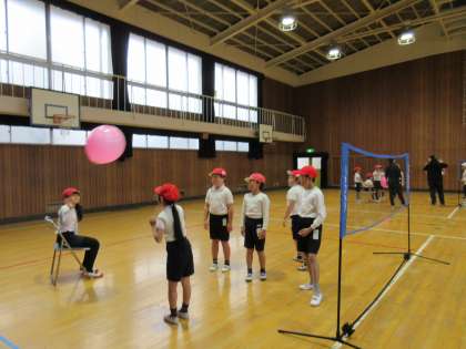 ネットを挟んで、椅子に座った児童にやさしいパスを出して、チームのみんながパスを受けてから相手コートに返すことがしっかりできました。