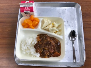 献立:ハヤシライス、カリフラワーとコーンのサラダ、みかん(缶)、牛乳
