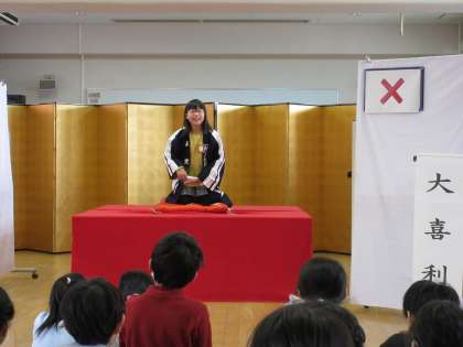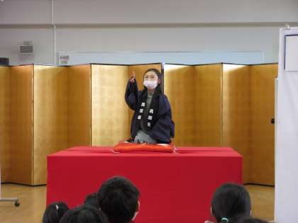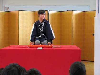 おはやしも本物ならば羽織や扇子、手ぬぐいも本物です。落語家になった4年生は見事に落語を演じ切りました。