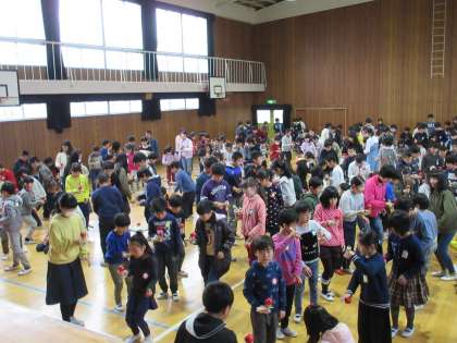 毎週木曜日の始業時前は、ふれあい集会(全校児童による縦割り班活動)です。本日はけん玉集会です。