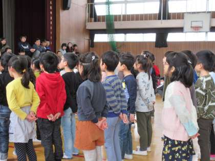全校児童による6年生を送る会がありました。1年生から5年生までが6年生への感謝の言葉とともに、合唱や合奏をおこないました。