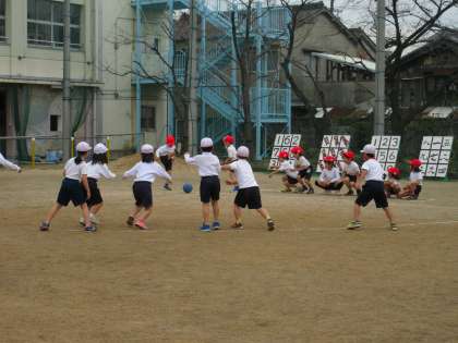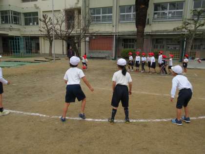 ボール運動を行っています。キックベースボールの基本となる運動です。いつも元気な1年生たちです。