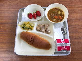 献立:フライドチキン、カレーシチュー、春のカラフルソテー、いちご、パン、牛乳