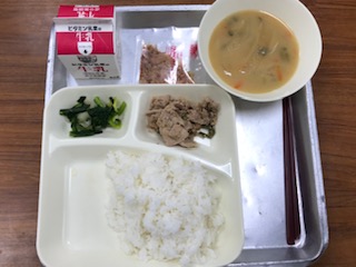 献立:豚肉のごまだれ焼き、みそ汁、こまつなのおひたし、ごはん、牛乳