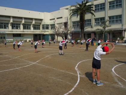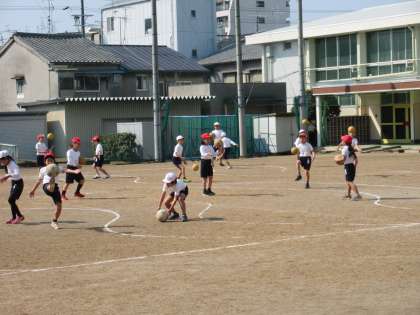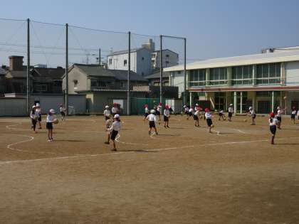 グラウンド前面に展開して2年生がボール蹴りの練習をしています。かなりリフティンぐの上手な児童もいます。