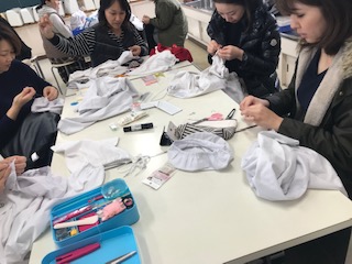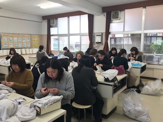 今日は土曜日で学校は休みですが、PTAの実行委員の方々が集まって、子どもたちが1年間使用した白衣の補修をしていだだきました。