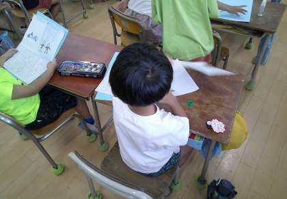 1年生の教室では夏休みの日記について見せ合ったり紹介し合ったりしていました。それぞれの夏休みについて教えてくれるので楽しいひと時でした。