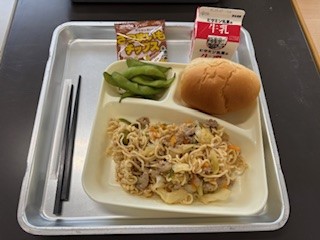今日の献立は、焼きそば、えだまめ、おさつチップス、ミニコッペパン、牛乳です。