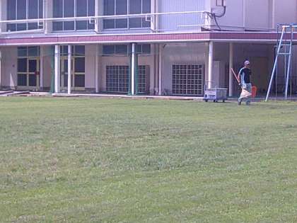 夏休みにも2回、管理作業員さんに芝を刈ってもらっていますが、早くも伸びてきています。そこで本日、管理作業員さんと先生たちで芝を刈りこみました。
