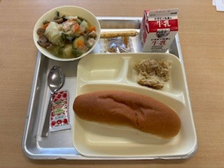 今日の献立は、とうふローフ、ケチャップ(袋)、洋風煮、棒チーズ、コッペパン、みかんジャム、牛乳です。