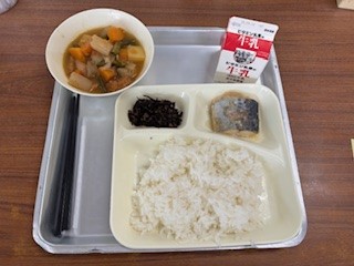 今日の献立は、さごしのおろしじょうゆかけ、含め煮、牛ひじきそぼろ、ごはん、牛乳です。