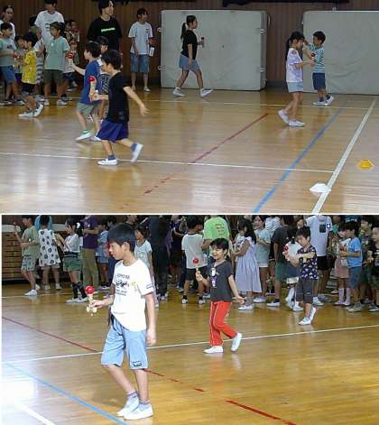 玉を小皿に乗せたり、中皿乗せたり、けん先と大皿の間に乗せたり、学年によって難易度を変えてリレーしていきます。
