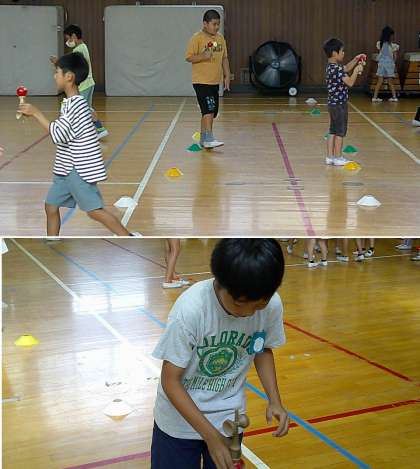 たてわり班ごとに、けん玉の玉を乗せた状態でコーンを回ります。