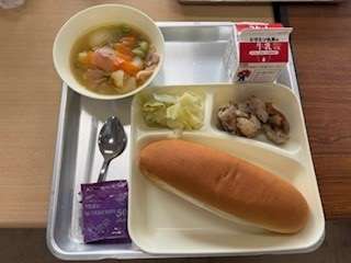 今日の献立は、鶏肉のバジル焼き、ベーコンと野菜のスープ煮、キャベツときゅうりのサラダ、コッペパン、ブルーベリージャム、牛乳です。
