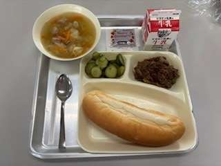 今日の献立は、牛肉のデミグラスソース煮、ウインナーのスープ、きゅうりのピクルス、コッペパン、いちごジャム、牛乳です。