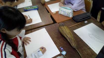 ヘチマの観察をしてきましたが、干したヘチマはどうなっているのか観察したり触ったりしながら絵をかきました。