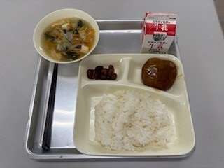 今日の献立は、和風ハンバーグ、五目汁、金時豆の煮もの、ごはん、牛乳です。