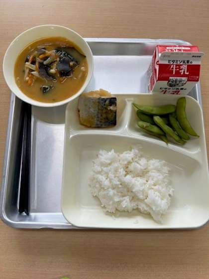 今日の献立は、さごしのみぞれかけ、かぼちゃのみそ汁、えだまめ、ごはん、牛乳です。