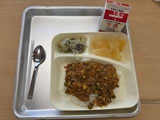 今日の献立は、大豆入りキーマカレーライス、キャベツのひじきドレッシング、和なし(カット缶)、ごはん、牛乳です。