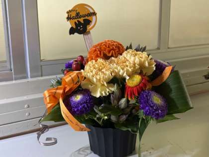 ハロウィンも近いので、ハロウィンの飾り付けをしたフラワーアレンジメントでとてもきれいです。