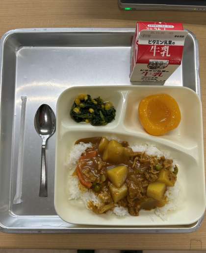 今日の献立は、ポークカレーライス(ごはん)、ほうれんそうのソテー、黄桃(缶)、牛乳です。